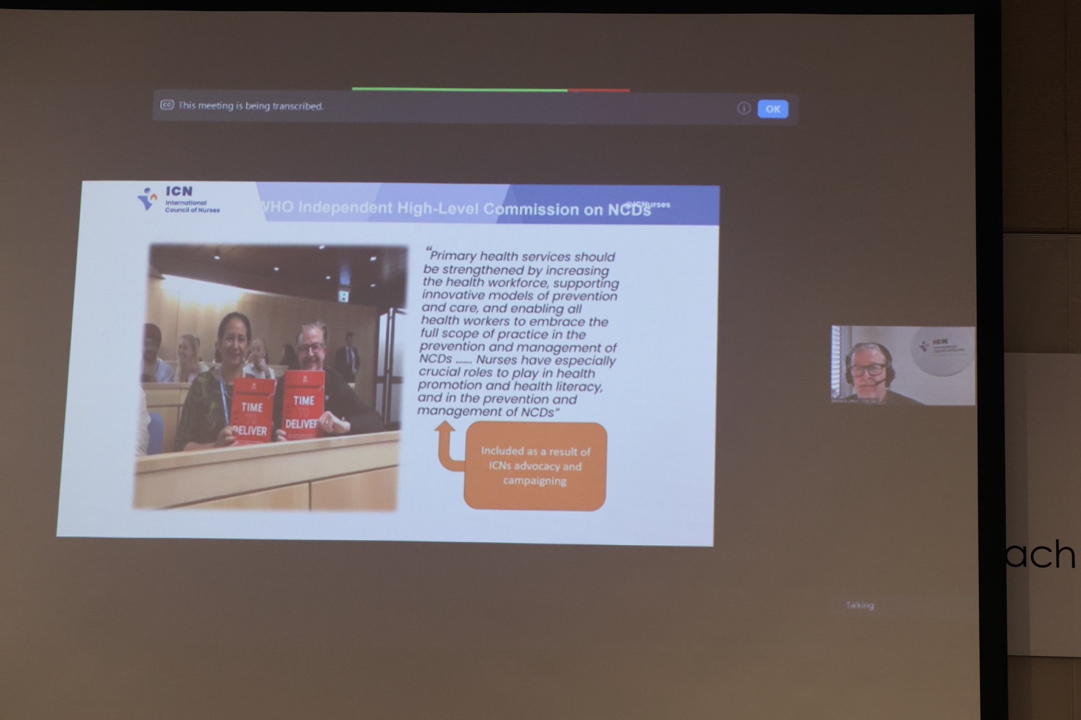 ประเด็น NCD Fighting: Empowering Individual and Community Approach โรคไม่ติดต่อเรื้อรัง (NCDs) เป็นประเด็นสำคัญที่โลกกำลังเผชิญสถานการณ์วิกฤต โดยเฉพาะการเปลี่ยนแปลงทางประชากร ซึ่งจากการสำรวจสุขภาพประชาชนไทยโดยการตรวจร่างกายในช่วง 20 ปีที่ผ่านมา พบว่าโรค NCDs มีแนวโน้มเพิ่มสูงขึ้นอย่างชัดเจน เช่น โรคเบาหวานมีความชุกเพิ่มขึ้นจาก 7% เป็น 10.6% โรคความดันโลหิตสูง เพิ่มขึ้นจาก 20% เป็นเกือบ 30% โดยในการประชุมฯ ได้มีการนำเสนอนวัตกรรมการดูแลสุขภาพและแลกเปลี่ยนประสบการณ์ที่เชื่อมช่องว่างระหว่างชุมชนและระบบบริการสุขภาพที่สนับสนุนการแก้ปัญหาโรค NCDs การสร้างความเข้มแข็งให้รายบุคคลและชุมชนผ่านบทบาทของพยาบาลชุมชน และเทคโนโลยีในการส่งเสริมสุขภาพ ป้องกันโรค และการดูแลสุขภาพอย่างครบวงจร ตลอดจนการถอดบทเรียนและกำหนดแนวทางในอนาคตจากตัวอย่างการดำเนินงานที่หลากหลายของประเทศต่างๆ อาทิ ญี่ปุ่น อินโดนีเซีย อินเดีย สหรัฐอเมริกา ไทย โดยในการประชุมได้มีการแลกเปลี่ยนในประเด็นสำคัญ เช่น บทบาทพยาบาลในการเสริมสร้างพลังให้ปัจเจกบุคคลและชุมชนเพื่อต่อสู้กับ NCDs ในยุคเปลี่ยนผ่านทางประชากร การป้องกันและส่งเสริมสุขภาพของประเทศญี่ปุ่น ประสบการณ์การดูแลผู้ป่วยเบาหวานที่บ้าน การเสริมสร้างทักษะการดูแลตนเองให้กับผู้ป่วยเบาหวานผ่านการเยี่ยมบ้านโดยพยาบาลชุมชนของประเทศไทย การปฏิรูประบบสาธารณสุข มุมมองด้านการพยาบาลในการบูรณาการระบบบริการปฐมภูมิ ภายใต้นโยบายการเปลี่ยนแปลงระบบสุขภาพในอินโดนีเซีย บทบาทพยาบาลในการออกแบบระบบป้องกันและสร้างผลลัพธ์ทางสุขภาพที่ดีในระดับชุมชนของประเทศอินเดีย นวัตกรรมการจัดการตนเองและการดูแลผู้สูงอายุอย่างมีส่วนร่วม โดยอาศัยเทคโนโลยีส่งเสริมสุขภาพ บทเรียนจากสหรัฐอเมริกา ฯลฯ