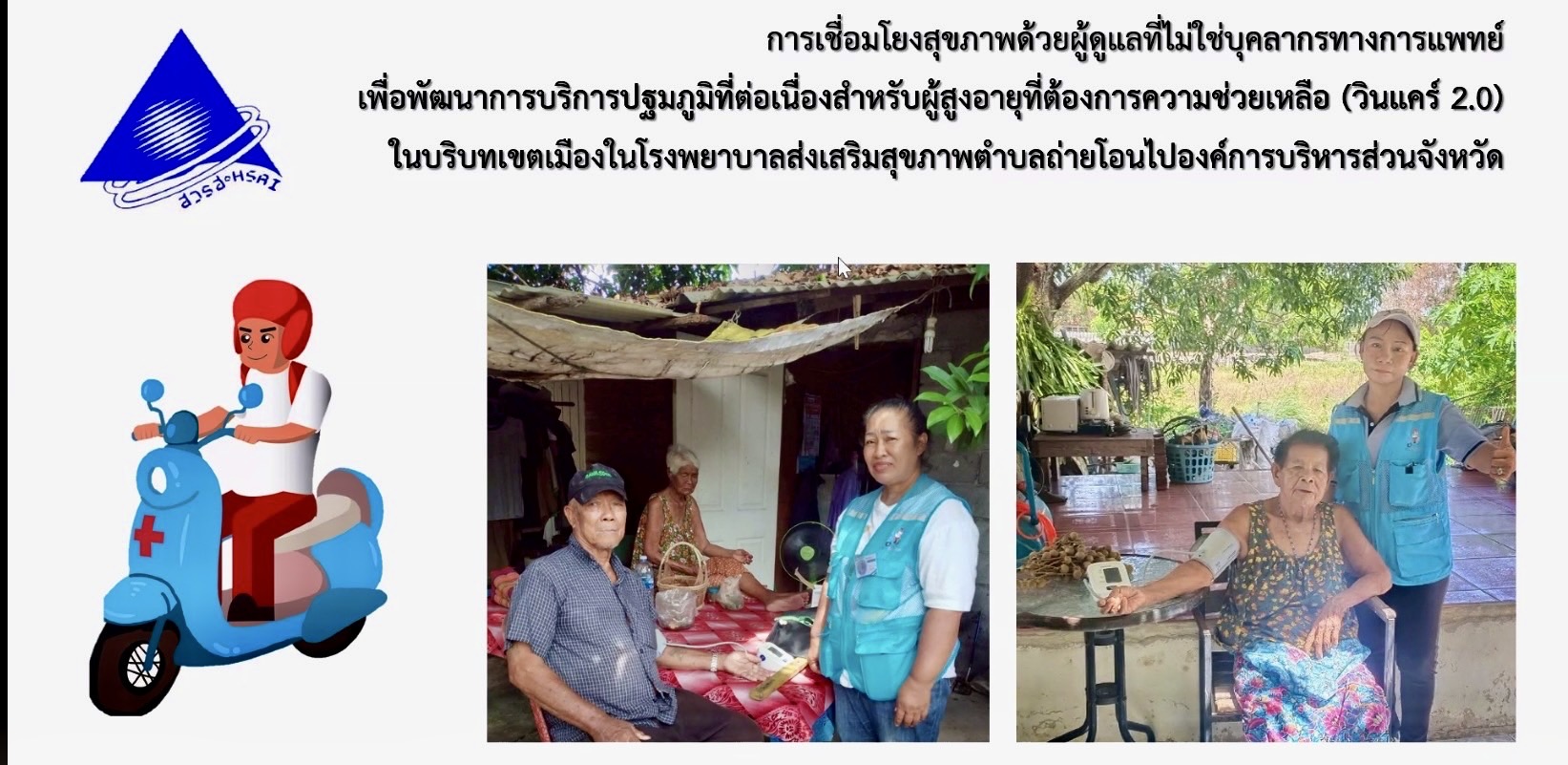 ประเทศไทยเข้าสู่การเป็นสังคมสูงวัยอย่างสมบูรณ์ โดยมีประชากรอายุ 60 ปีขึ้นไป มากกว่า 20% ของประชากรทั้งหมด และในปี 2567 ผู้สูงอายุมีจำนวนมากกว่า 14 ล้านคน ซึ่งเพิ่มขึ้นอย่างรวดเร็ว ส่วนผู้สูงอายุที่ต้องอยู่คนเดียวหรือเพียงลำพังกับคู่สมรส สูงถึง 5.4 ล้านคน และกว่า 50% ของผู้ป่วยโรคเรื้อรังที่เป็นผู้สูงอายุต้องอยู่คนเดียวหรือเพียงลำพังกับคู่สมรสในบ้าน ซึ่งในกลุ่มผู้ป่วยโรคเรื้อรัง จำเป็นต้องมีการดูแลรักษาโดยการนัดตรวจติดตามอย่างต่อเนื่อง หรือเพิ่มประสิทธิภาพการรักษาโดยการปรับยา การรับประทานยาอย่างต่อเนื่อง การปรับเปลี่ยนพฤติกรรมสุขภาพ การลดน้ำหนัก ดังนั้นผู้สูงอายุที่ป่วยด้วยโรคเรื้อรังส่วนหนึ่งจึงต้องการผู้ดูแล แม้จะยังไม่ถึงระดับป่วยติดเตียงก็ตาม เพื่อคุณภาพการรักษาและคุณภาพชีวิตที่ดีของผู้ป่วย