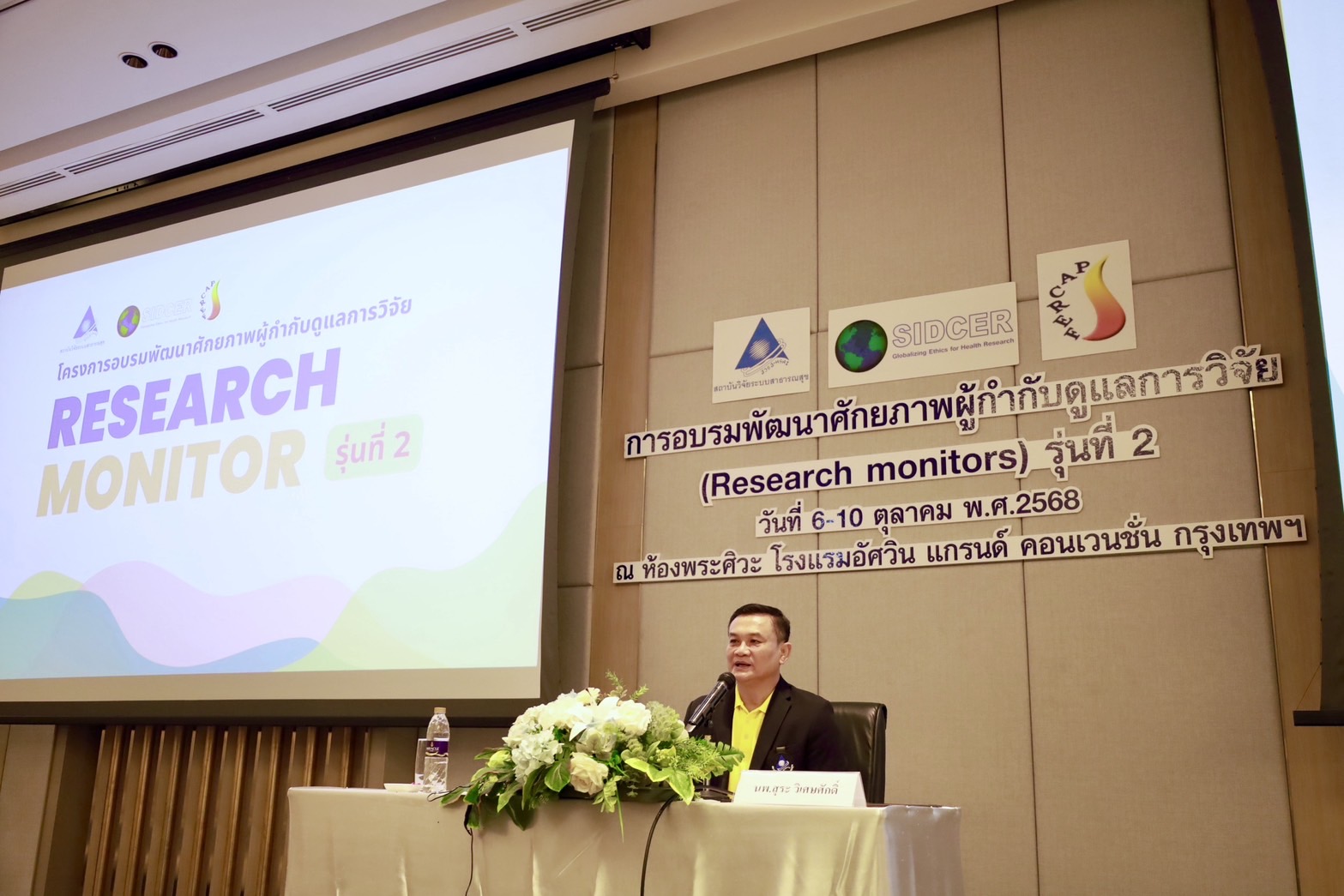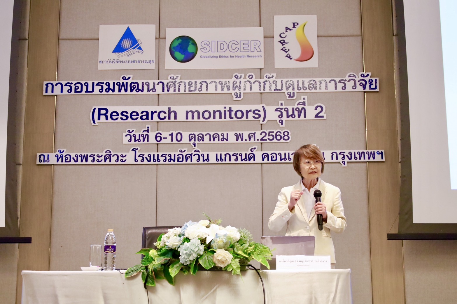 ทั้งนี้การกำกับดูแลการวิจัยต้องดำเนินการโดยผู้ที่มีความรู้และความชำนาญเกี่ยวกับการทำวิจัยตามหลักการ GCP ในทุกขั้นตอน อาทิ มีความรู้ด้านภาษาที่ใช้ในสถานที่วิจัย เพื่อใช้ในการสื่อสารกับผู้วิจัย มีความสามารถในการตรวจสอบเอกสารต่างๆ ที่เกี่ยวข้องกับการวิจัย สามารถบันทึกข้อมูลและประเด็นที่ได้จากการพูดคุยกับผู้วิจัย และมีการตรวจสอบอย่างรวดเร็ว เพื่อแก้ปัญหาหรือควบคุมคุณภาพของงานวิจัยได้ทันเวลา ดังนั้นเพื่อเป็นการพัฒนาบุคลากรให้สามารถทำหน้าที่เป็นผู้กำกับดูแลการวิจัยได้อย่างเชี่ยวชาญ และสร้างความมั่นใจว่าข้อมูลทั้งหมดที่ได้จากการวิจัยมีความน่าเชื่อถือและมีคุณภาพตามมาตรฐานสากล รวมทั้งมีการประมวลผลอย่างถูกต้อง สถาบันวิจัยระบบสาธารณสุข (สวรส.) จึงจัดการอบรมพัฒนาศักยภาพผู้กำกับดูแลการวิจัย (Research monitor) รุ่นที่ 2 โดยมีวิทยากรผู้เชี่ยวชาญด้านการวิจัยคลินิกและจริยธรรมการวิจัยในมนุษย์ ร่วมให้ความรู้อย่างเข้มข้น อาทิ ศ.เกียรติคุณ ดร.พญ.จันทรา เหล่าถาวร มูลนิธิซิดเคอร์-เฟอร์แคปฯ ศ.พญ.ขวัญชนก ยิ้มแต้ คณะแพทย์ศาสตร์รามาธิบดี มหาวิทยาลัยมหิดล ผศ.ดร.พญ.พรรณทิพา ว่องไว คณะแพทยศาสตร์ มหาวิทยาลัยขอนแก่น รศ.พญ.สมฤดี ฉัตรสิริเจริญกุล คณะแพทยศาสตร์ศิริราชพยาบาล มหาวิทยาลัยมหิดล ศ.ดร.พญ.ทิพวรรณ เลียบสื่อตระกูล คณะแพทยศาสตร์ มหาวิทยาลัยสงขลานครินทร์ ภก.ฉัตรชัย ชาญวิบูลย์ศรี บริษัทRoche ประเทศไทย ศ.ดร.เกศรา ณ บางช้าง วิทยาลัยแพทยศาสตร์นานาชาติจุฬาภรณ์ มหาวิทยาลัยธรรมศาสตร์ และ ดร.ภญ.นพคุณ ธรรมธัชอารี สถาบันวิจัยระบบสาธารณสุข ทั้งนี้ผู้เข้าร่วมการอบรมฯ เป็นเครือข่ายการวิจัยคลินิกในระบบสุขภาพ เช่น แพทย์ พยาบาล เภสัชกร นักวิจัย ผู้ช่วย/ผู้ประสานงานวิจัย ฯลฯ จากสถานพยาบาล สถาบันการศึกษา หน่วยงานในกระทรวงสาธารณสุข จำนวน 74 คน โดยการอบรมฯ ดังกล่าว จัดขึ้นระหว่างวันที่ 6-10 ต.ค. 2568 ณ โรงแรมอัศวิน แกรนด์ คอนเวนชั่น กทม.