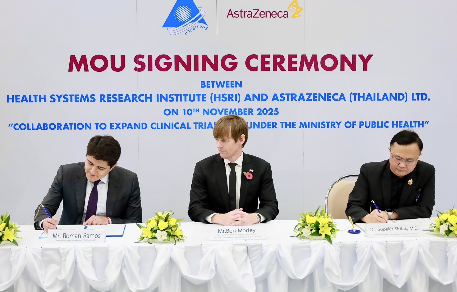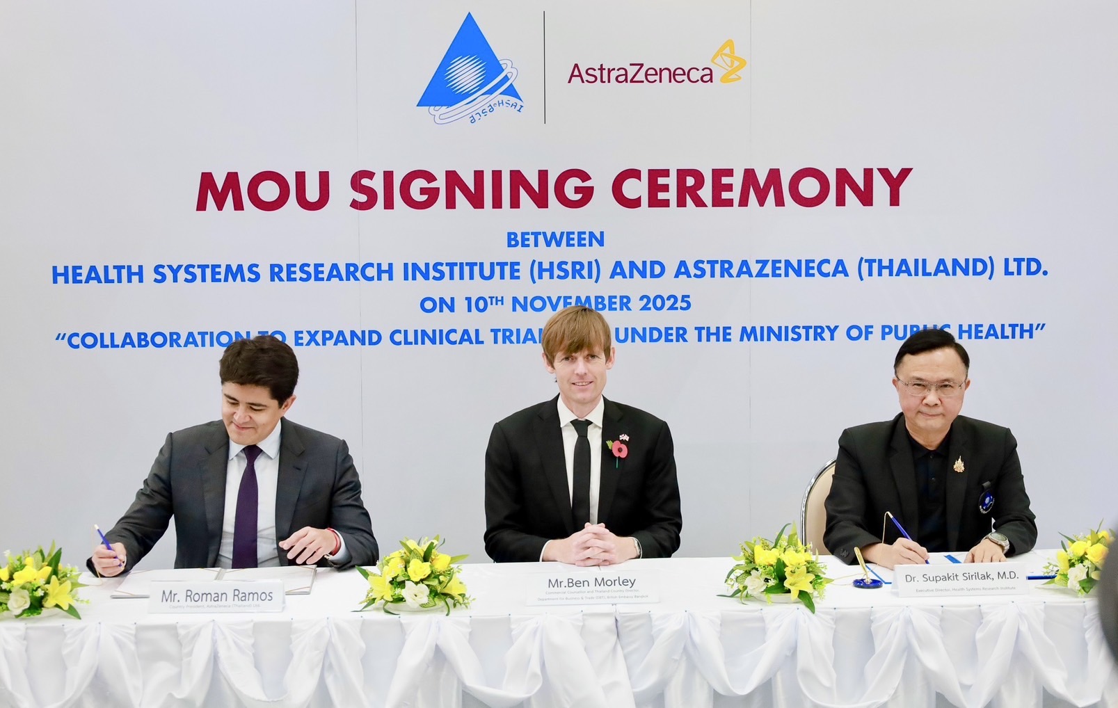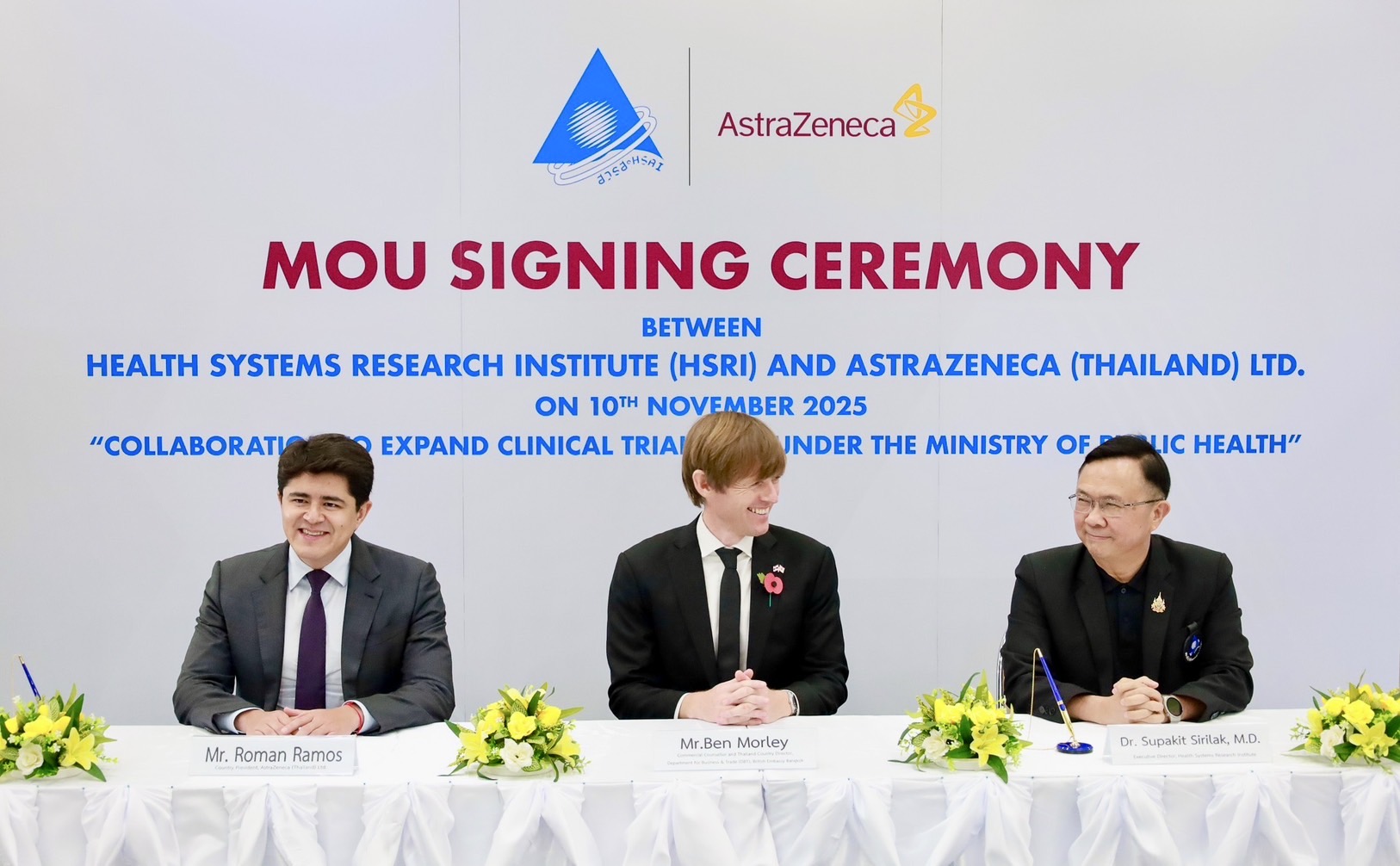 นายโรมัน รามอส ประธานบริษัทประจำประเทศไทย บริษัท แอสตร้าเซนเนก้า (ประเทศไทย) จำกัด กล่าวว่า การทดลองทางคลินิกถือเป็นกลไกหลักในการนำการรักษาเชิงนวัตกรรมมาสู่ผู้ป่วย การขยายศูนย์วิจัยคลินิกไปยังโรงพยาบาลภายใต้สังกัดกระทรวงสาธารณสุขจะช่วยให้การวิจัยสามารถเข้าถึงผู้ป่วยได้เป็นจำนวนมากและมีความหลากหลายของผู้ป่วยมากขึ้น ซึ่งเป็นประโยชน์อย่างมากต่อการศึกษาวิจัย โดยแอสตร้าเซนเนก้าพร้อมที่จะสนับสนุนการถ่ายทอดความรู้ที่จำเป็นสำหรับบุคลากรด้านการวิจัยของโรงพยาบาลสังกัดกระทรวงสาธารณสุขที่เข้าร่วมโครงการ และสร้างระบบนิเวศที่เอื้อต่อการวิจัยทางคลินิกจากต่างประเทศ เพื่อดึงการทดลองทางคลินิกในระดับโลกเข้ามาดำเนินการในประเทศไทยมากขึ้น