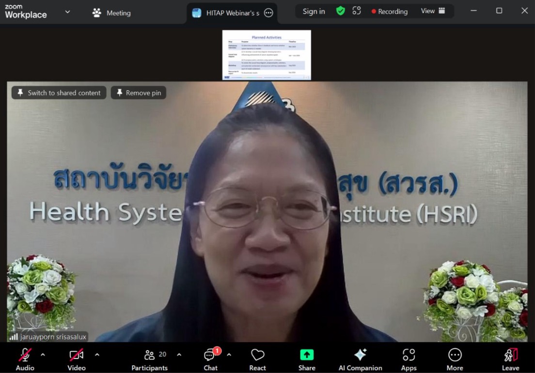 ด้าน ผศ.ดร.จรยพร รอง ผอ.สวรส. ได้เน้นย้ำถึงหลักการสำคัญคือ Value-Based Healthcare หรือการพัฒนาระบบสุขภาพที่มุ่งเน้นคุณค่า และแนะนำให้ใช้ Causal Loop Diagram ในการวิเคราะห์พลวัตของระบบ เพื่อให้เห็นถึงที่มาของผลลัพธ์นโยบายอย่างเป็นรูปธรรม โดยระบุว่า ข้อเสนอแนะเชิงนโยบายที่ได้จากงานวิจัยต้องออกแบบให้ครอบคลุมทุกมิติ และมุ่งเน้นผลลัพธ์ที่ชัดเจน เพื่อให้เกิดผลสัมฤทธิ์ที่เป็นรูปธรรมต่อระบบสุขภาพของประเทศในระยะยาว