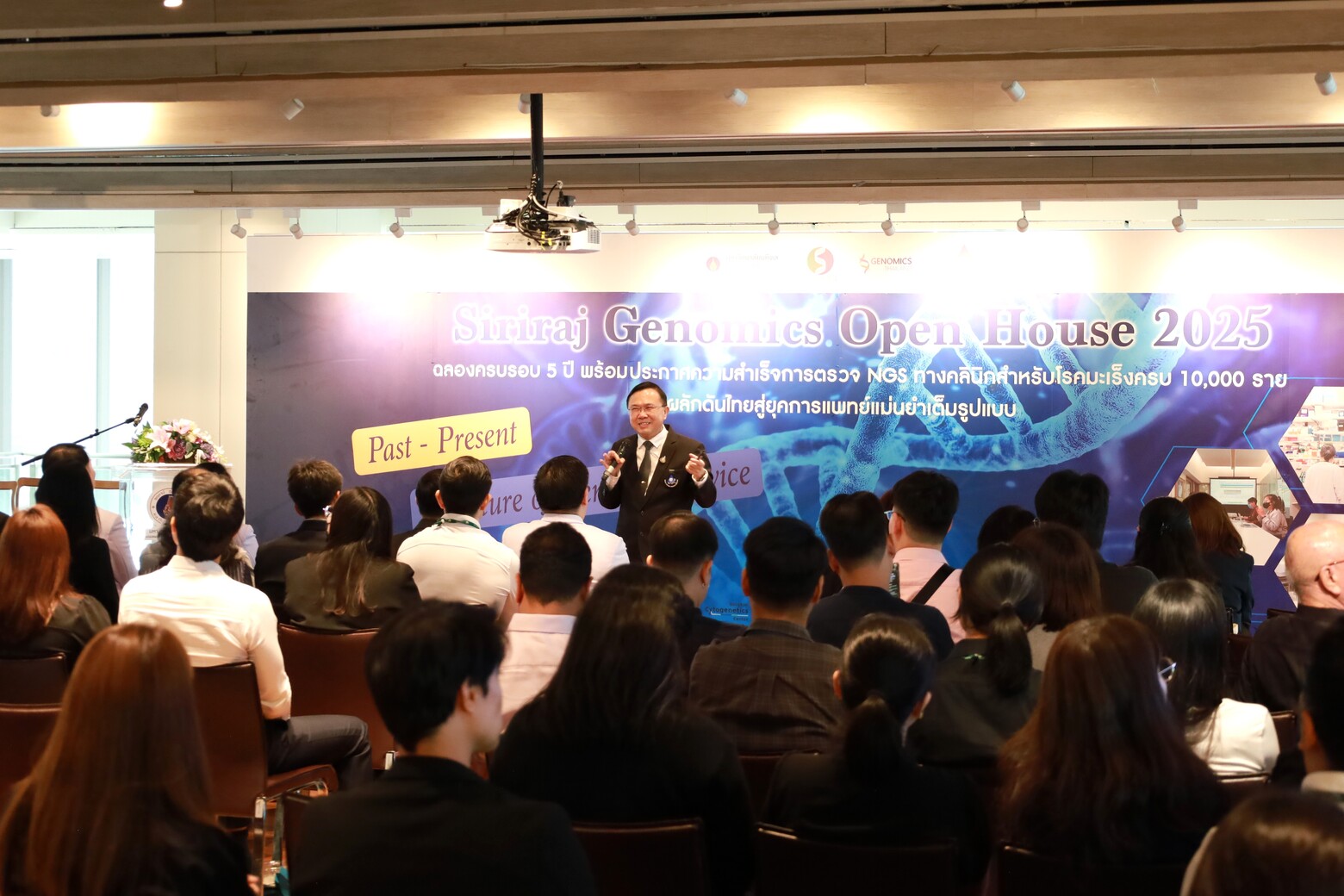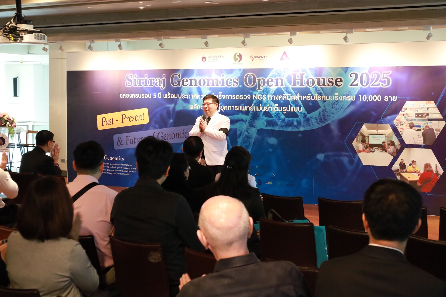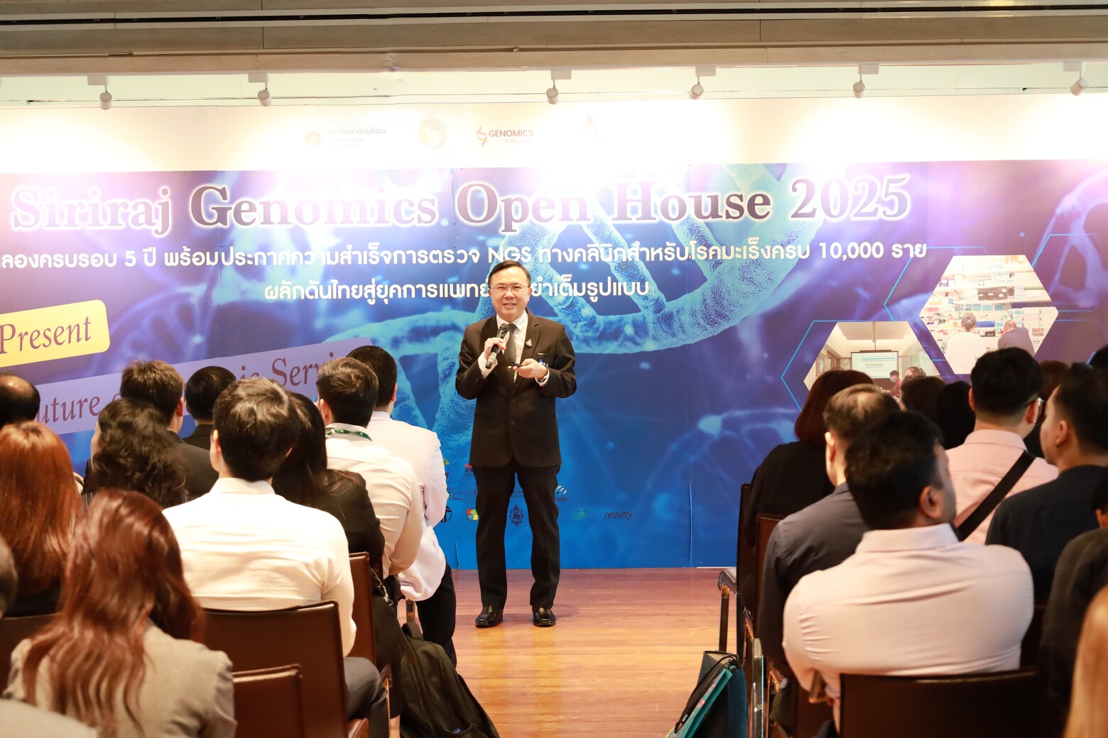 ศ.ดร.นพ.ยงยุทธ ศิริวัฒนอักษร ผู้อำนวยการโรงพยาบาลศิริราช เป็นประธานพิธีเปิดงาน Siriraj Genomics Open House 2025 กล่าวว่า ศูนย์จีโนมิกส์ศิริราช เป็นหน่วยงานสำคัญที่คณะแพทยศาสตร์ศิริราชพยาบาล ให้การสนับสนุน ถูกจัดตั้งขึ้นในปี 2563 ด้วยจุดประสงค์เพื่อรวมการวิจัย การเรียนการสอน และการให้บริการด้วยเทคโนโลยีจีโนม (genome technology) เข้าด้วยกันในหน่วยงานเดียว ทำหน้าที่ขับเคลื่อนการแพทย์จีโนมิกส์และการแพทย์แม่นยำทั้งภายในและภายนอกคณะฯ และเป็นตัวแทนของคณะฯ ในการประสานงานโครงการจีโนมิกส์ประเทศไทย เพื่อผลักดันให้ไทยก้าวเป็นผู้นำของการแพทย์จีโนมิกส์ในระดับภูมิภาคอาเซียน การให้บริการตรวจชุดยีนมะเร็งทางคลินิกครบ 10,000 ราย ถือเป็นหลักฐานสำคัญที่ยืนยันว่า ประเทศไทยมีศักยภาพและมีความพร้อมในการขับเคลื่อนการแพทย์จีโนมิกส์และการแพทย์แม่นยำ มีความสามารถในการให้บริการเทคโนโลยีระดับสูงได้เองโดยไม่ต้องพึ่งพาบริการจากต่างประเทศ