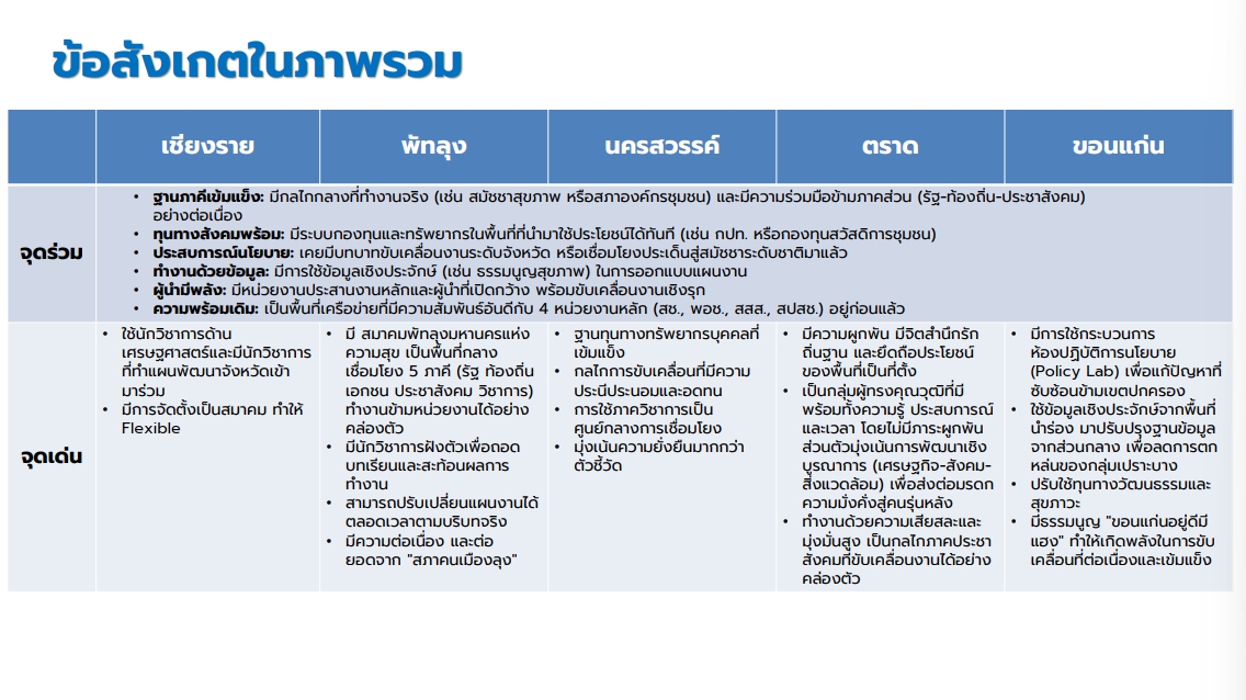 ผศ.ดร.จรวยพร ศรีศศลักษณ์ รองผู้อำนวยการสถาบันวิจัยระบบสาธารณสุข (สวรส.) ได้นำเสนอทิศทางการขับเคลื่อนแผนงานการสร้างจังหวัดเข้มแข็งโดยใช้พื้นที่เป็นฐาน และรายงานความก้าวหน้าของงานวิจัยการประเมินผลฯ โดยระบุว่า สวรส. มุ่งเน้นการสนับสนุนด้านวิชาการผ่านเครื่องมือการประเมินเชิงพัฒนา (Developmental Evaluation: DE) ซึ่งใช้กรอบการวิเคราะห์ Design-Implement-Governance เป็นหัวใจสำคัญ ซึ่งการออกแบบการดำเนินการได้ขอให้แต่ละจังหวัด จัดลำดับความสำคัญของปัญหาให้ชัดเจน เพื่อให้ทีมวิจัยสามารถวัดผลเปรียบเทียบกับค่าฐาน (Baseline) และเพื่อให้ประเมินได้ว่าทิศทางการบริหารจัดการจากส่วนกลางสามารถนำไปสู่การปฏิบัติในระดับพื้นที่ได้อย่างมีประสิทธิภาพเพียงใด ซึ่งผลการวิจัยเบื้องต้นพบว่าทั้ง 5 จังหวัด มีบทเรียนที่จุดร่วมใน 5 ด้าน ได้แก่ 1) ฐานภาคีเข้มแข็ง มีกลไกกลางที่ทำงานจริงความร่วมมือข้ามภาคส่วน ทั้งรัฐ-ท้องถิ่น-ประชาสังคม อย่างต่อเนื่อง 2) ทุนทางสังคมพร้อม มีระบบกองทุนและทรัพยากรในพื้นที่ที่นำมาใช้ประโยชน์ได้ทันที 3) ประสบการณ์นโยบาย มีบทบาทขับเคลื่อนงานระดับจังหวัด หรือเชื่อมโยงประเด็นสู่สมัชชาระดับชาติมาแล้ว 4) ทำงานด้วยข้อมูล มีการใช้ข้อมูลเชิงประจักษ์ในการออกแบบแผนงาน 5) ผู้นำมีพลัง มีหน่วยงานประสานงานหลักและผู้นำที่เปิดกว้าง พร้อมขับเคลื่อนงานเชิงรุก แต่ละจังหวัดมีความเข้มแข็งของภาคประชาสังคม ภาควิชาการ ที่จะช่วยหนุนเสริมให้การแก้ไขปัญหาของภาครัฐในจังหวัดได้ ขึ้นอยู่กับการเลือกประเด็นปัญหาของแต่ละจังหวัด ส่วนการประเมินผลเบื้องต้นของการดำเนินงานของคณะกรรมการภาคีสานพลัง (ส่วนกลาง) ยังต้องรอการทบทวนและการวิเคราะห์ข้อมูลจากรายงานการประชุมและเอกสารอื่นๆ ที่เกี่ยวข้องก่อน