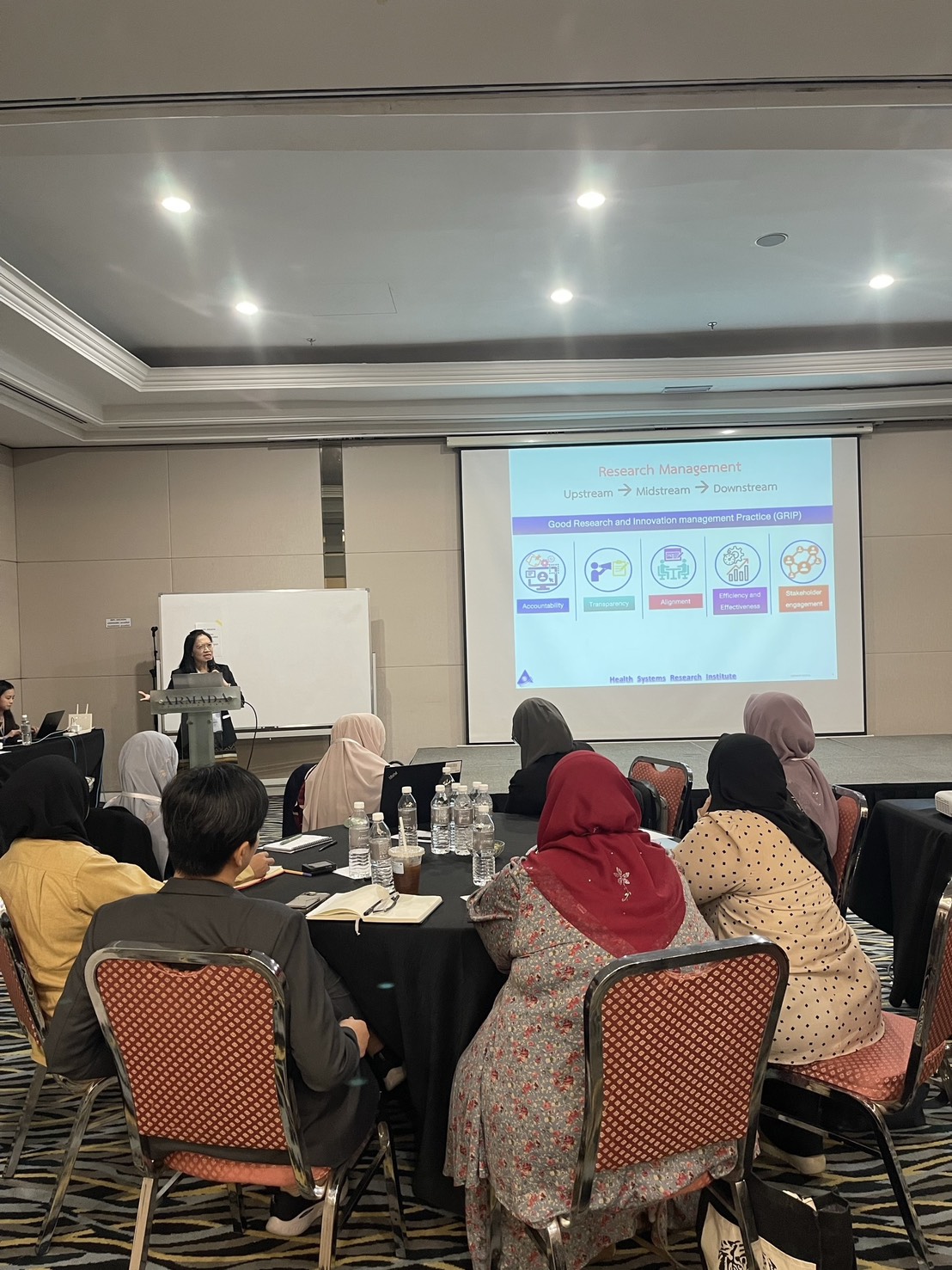 ผศ.ดร.จรวยพร ศรีศศลักษณ์ รองผู้อำนวยการสถาบันวิจัยระบบสาธารณสุข ได้บรรยายในหัวข้อ “Research Management Perspectives : Insights from Thailand” และร่วมแบ่งปันประสบการณ์การบริหารจัดการงานวิจัยว่า ประเทศไทยมีแนวปฏิบัติที่ดีด้านการบริหารงานวิจัยและนวัตกรรม หรือ Good Research and Innovation management Practice (GRIP) โดยมีองค์ประกอบได้แก่ ความรับผิดรับชอบ (Accountability), ความโปร่งใสตรวจสอบได้และเปิดเผยข้อมูลสู่สาธารณะ (Transparency), การสอดประสานการทํางานเพื่อบรรลุเป้าหมายร่วมกัน (Alignment), การบริหารงานที่มีประสิทธิภาพและเกิดประสิทธิผล (Efficiency and Effectiveness) และการมีส่วนร่วมของผู้มีส่วนได้ส่วนเสียและความไว้วางใจจากสาธารณะ (Stakeholder engagement and Public trust earning) เป็นเครื่องมือสำคัญในการพัฒนาและยกระดับการบริหารจัดการงานวิจัยของหน่วยรับงบประมาณจากกองทุน ววน. รวมถึง PMUs โดยระบบนิเวศการให้ทุนวิจัยของประเทศไทยประกอบด้วย Research Support System และ Research Operational System โดยมีกลไกการกำกับทิศทางและนโยบาย การจัดสรรงบประมาณ การดูแลเรื่องจำนวนและคุณภาพของนักวิจัย บุคลากรบริหารจัดการงานวิจัย โครงสร้างพื้นฐานด้านการวิจัย การดูแลผลผลิตและการนำผลงานวิจัยไปใช้ประโยชน์ โดยสถาบันวิจัยระบบสาธารณสุขดำเนินการบริหารจัดการงานวิจัยตั้งแต่กระบวนการต้นน้ำ กลางน้ำ ไปจนถึงปลายน้ำ ครอบคลุมตั้งแต่การกำหนดโจทย์วิจัย การบริหารโครงการ ไปจนถึงการนำผลงานวิจัยไปใช้ประโยชน์เชิงนโยบายและเชิงพาณิชย์ นอกจากนี้ยังมีการพัฒนานักวิจัย ที่เน้นการเรียนรู้แบบผสมผสาน เช่น การอบรมเชิงปฏิบัติการ และการมีพี่เลี้ยง (mentoring) รวมถึงการเรียนรู้จากการทำงานจริง ซึ่งพิสูจน์แล้วว่าสามารถพัฒนาศักยภาพของนักวิจัยได้ และ สกสว.ได้สนับสนุนให้มีการจัดอบรมหลักสูตร RDI manager และหลักสูตรพัฒนาศักยภาพระดับปฏิบัติการด้านการบริหารจัดการงานวิจัยและนวัตกรรมให้กับ Project officer อย่างไรก็ตาม ยังมีความท้าทายหลายด้านที่ระบบวิจัยไทยเผชิญอยู่ เช่น ข้อจำกัดด้านทรัพยากร ไม่ว่าจะเป็นงบประมาณ บุคลากรในระบบวิจัยทั้งนักวิจัย และบุคลากรด้านบริหารจัดการงานวิจัย (Research Management Professional : RMP) ในด้านภาพรวมของสถาบันและบริบทด้านบุคลากร การมีปฏิสัมพันธ์และความร่วมมือกับนักวิจัย และยังมีอีกหลาย area ที่สามารถพัฒนาขีดความสามารถในอนาคต เช่น การพัฒนาความร่วมมือและการสร้างพันธมิตร การติดตามและการรายงานโครงการ นโยบายการวิจัย การจัดการผู้มีส่วนได้ส่วนเสีย จริยธรรมการวิจัย ธรรมาภิบาลการบริหารจัดการงานวิจัย