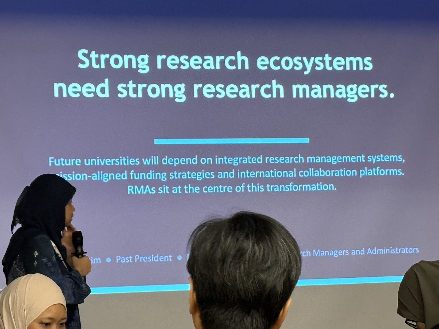 Prof. Ir.Dr. Shaliza Binti Ibrahim, Universiti Tenaga Nasional ได้บรรยายในหัวข้อ “Research Ecosystem and Roles of Research Management and Administration” ว่า ระบบนิเวศการวิจัย มีความซับซ้อน จึงต้องเน้นการทำงานร่วมกันมากขึ้น โดย RMAs มีบทบาทในการสนับสนุนนักวิทยาศาสตร์และนักวิจัยให้ก้าวข้ามข้อจำกัดด้านกฎระเบียบและนโยบาย เอื้ออำนวยการบริหารงบประมาณ และส่งเสริมการปฏิบัติตามมาตรฐานสากล นอกจากนี้ RMAs ยังมีบทบาทสำคัญในการเปลี่ยนแปลงการวิจัยแบบเน้นองค์ความรู้พื้นฐานไปสู่การวิจัยที่ มุ่งเน้นผลกระทบต่อสังคม และการสร้างความร่วมมือกับภาคอุตสาหกรรมมากขึ้น โดย Prof. Ir.Dr. Shaliza ได้เน้นย้ำว่า Strong research ecosystems need strong research managers