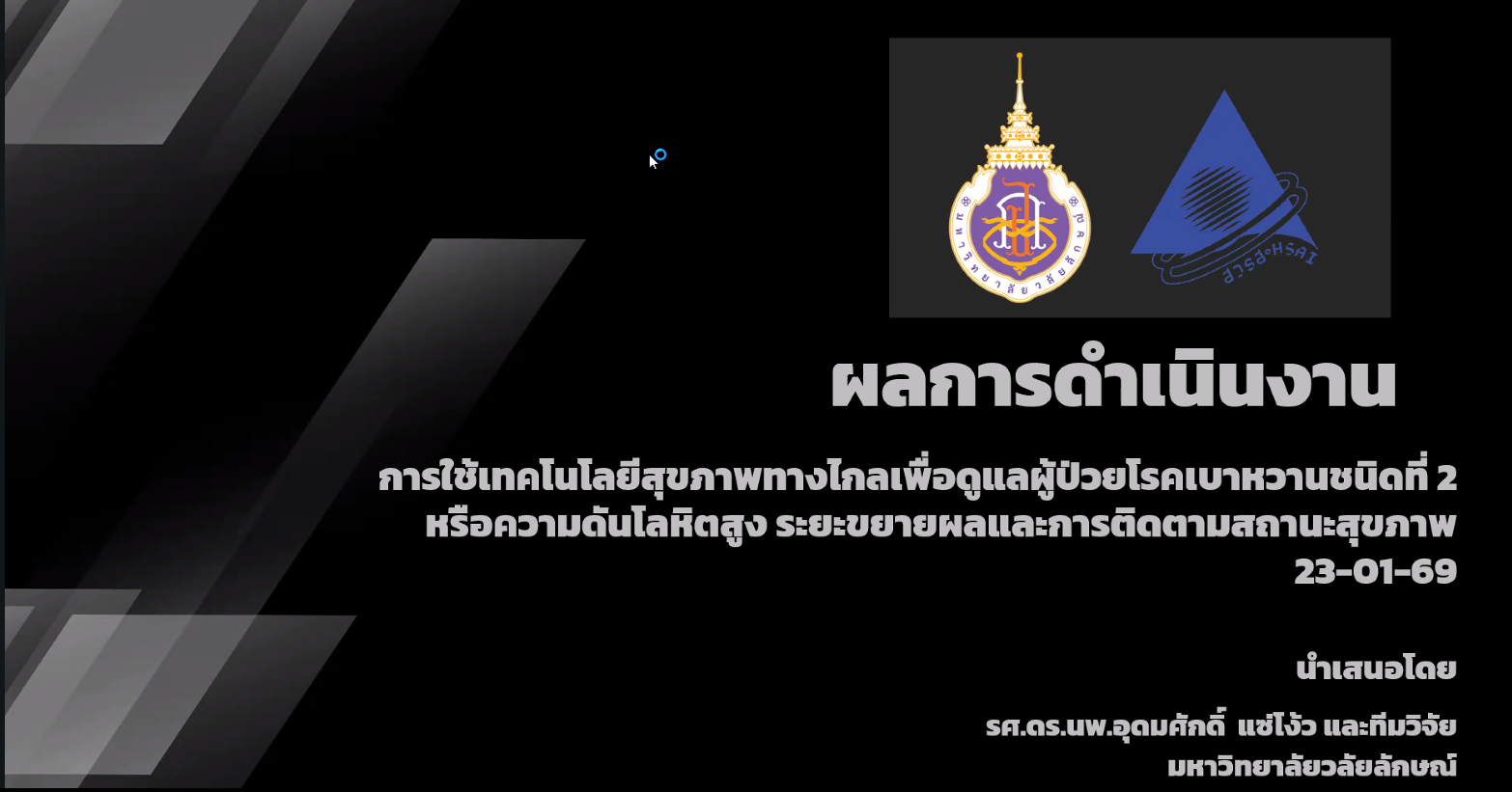 โครงการใช้เทคโนโลยีสุขภาพทางไกลเพื่อดูแลผู้ป่วยโรคเบาหวานชนิดที่ 2 หรือความดันโลหิตสูงระยะขยายผลและการติดตามสถานะสุขภาพ โดยมี รศ.ดร.นพ.อุดมศักดิ์ แซ่โง้ว เป็นหัวหน้าโครงการฯ ทั้งนี้งานวิจัยดังกล่าวเป็นการพัฒนาระบบการแพทย์ทางไกล เพื่อปรับปรุงการดูแลผู้ป่วยโรคเบาหวานและความดันโลหิตสูงให้มีประสิทธิภาพและต่อเนื่อง โดยเก็บข้อมูลในโรงพยาบาลสิชล จ.นครศรีธรรมราช โรงพยาบาลส่งเสริมสุขภาพตำบลบ้านต้นเหรียง และโรงพยาบาลเกาะสมุย จ.สุราษฎร์ธานี โดยระบบที่พัฒนาขึ้นนี้ เน้นการใช้งานง่าย เชื่อมโยงข้อมูลระหว่างผู้ป่วยและบุคลากรทางการแพทย์ผ่านแพลตฟอร์ม V-OPD และ Line OA มีฟังก์ชันการติดตามกิจกรรมการออกกำลังกายผ่าน AR (Augmented Reality) ซึ่งเป็นการผสมผสานโลกจริงเข้ากับองค์ประกอบดิจิทัล เพื่อส่งเสริมการดูแลสุขภาพที่บ้านและลดภาระการเดินทางของผู้ป่วยไปโรงพยาบาล โดยมีระบบ Line OA เป็นช่องทางในการติดต่อสื่อสารกับผู้ป่วย ทั้งในเรื่องของการแจ้งเตือน การปฏิบัติตัว ข้อมูลโภชนาการ และข้อมูลสุขศึกษาต่างๆ