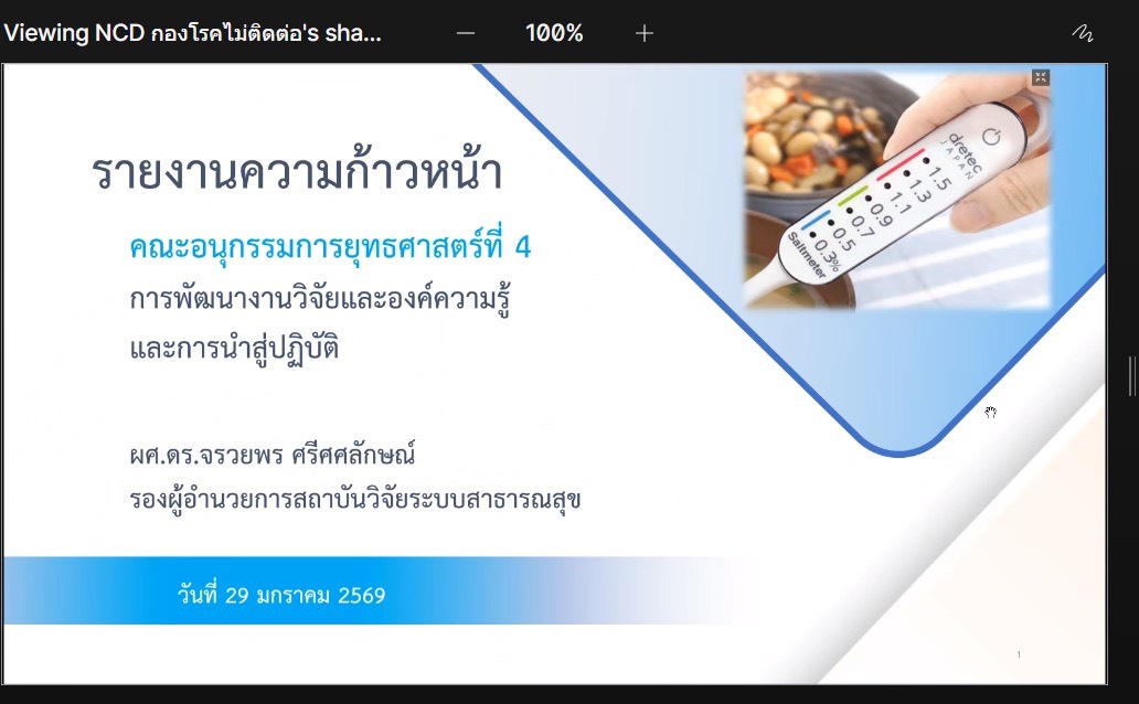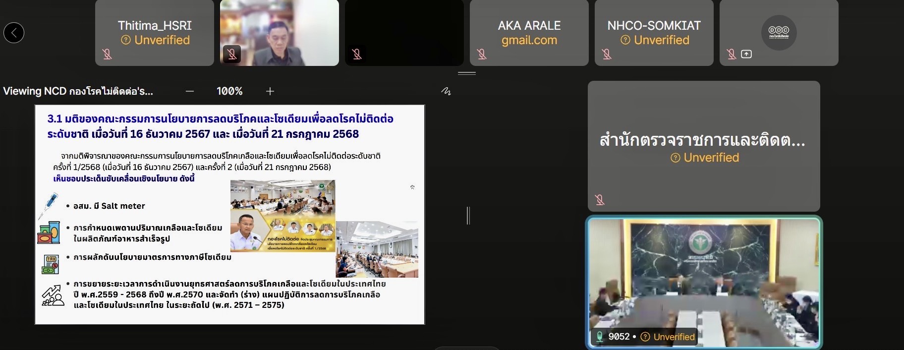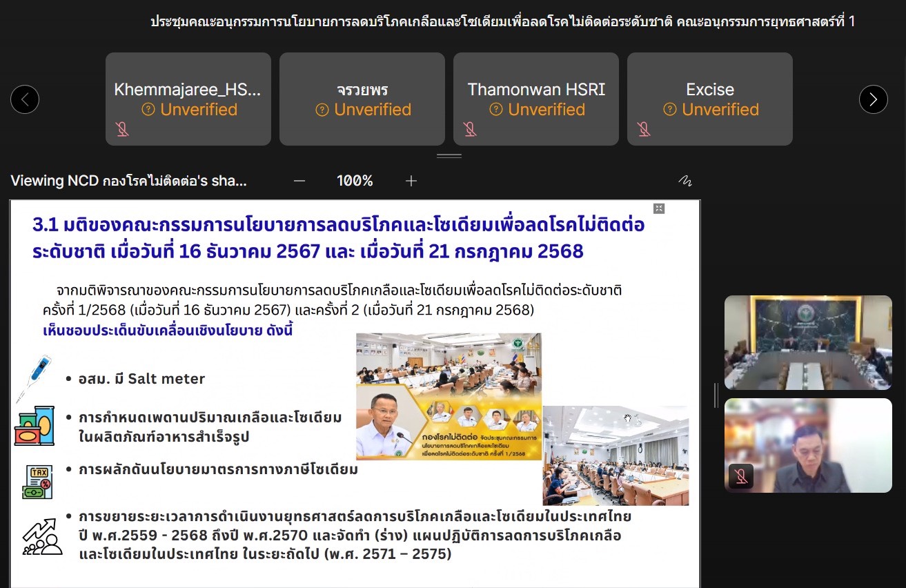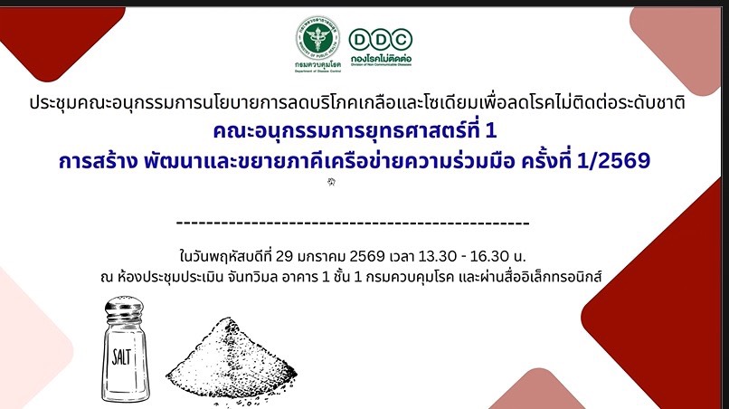 การประชุมคณะอนุกรรมการนโยบายการลดบริโภคเกลือและโซเดียมเพื่อลดโรคไม่ติดต่อระดับชาติ ครั้งที่ 1/2569 ณ ห้องประชุม ประเมิน จันทวิมล กรมควบคุมโรค และผ่านสื่ออิเล็กทรอนิกส์ Cisco WebEx Meeting โดยมี นพ.กฤษฎา หาญบรรเจิด ผู้อำนวยการกองโรคไม่ติดต่อ กรมควบคุมโรค และ ผศ.นพ.สุรศักดิ์ กันตชูเวสศิริ คณะแพทยศาสตร์โรงพยาบาลรามาธิบดี มหาวิทยาลัยมหิดล เป็นประธานการประชุม ได้มีการนำเสนอความก้าวหน้าและแผนการดำเนินงานขับเคลื่อนเชิงนโยบายลดการบริโภคเกลือโซเดียมเพื่อลดโรคไม่ติดต่อระดับชาติ ปีงบประมาณ 2569 โดยในยุทธศาสตร์ที่ 4 การพัฒนางานวิจัยและองค์ความรู้ และการนำสู่ปฏิบัติ สถาบันวิจัยระบบสาธารณสุข (สวรส.) โดย ผศ.ดร.จรวยพร ศรีศศลักษณ์ รองผู้อำนวยการ สวรส. ได้รายงานความก้าวหน้าของงานวิจัย โดยชี้ให้เห็นข้อมูลสถานการณ์สุขภาพคนไทยจากการสำรวจสุขภาพประชาชนไทยโดยการตรวจร่างกายครั้งที่ 7 ที่พบว่าคนไทยบริโภคโซเดียมสูงถึง 3,650 มิลลิกรัมต่อคนต่อวัน ซึ่งสูงกว่าระดับที่องค์การอนามัยโลก (WHO) แนะนำเกือบ 2 เท่า (WHO กำหนดไว้ไม่เกิน 2,000 มิลลิกรัมต่อวัน) ส่งผลให้ตัวเลขผู้ป่วยโรคไม่ติดต่อเรื้อรัง (NCDs) พุ่งสูงขึ้นอย่างต่อเนื่อง โดยเฉพาะโรคความดันโลหิตสูงที่มีจำนวนผู้ป่วยเพิ่มขึ้นถึงประมาณ 4 ล้านคนในช่วง 5 ปีที่ผ่านมา