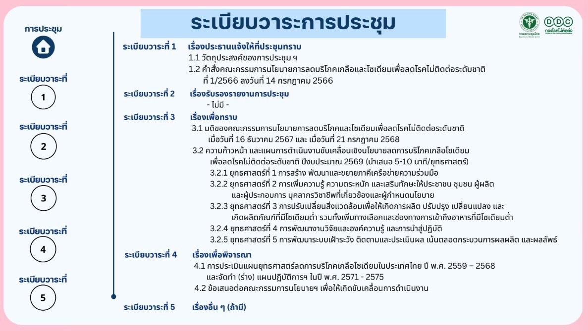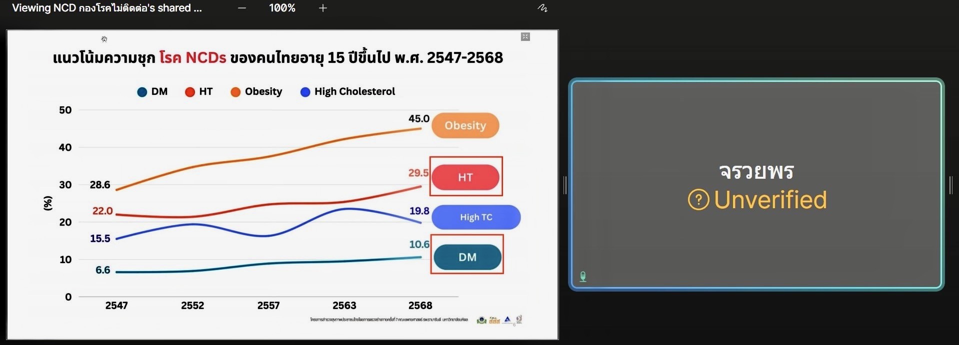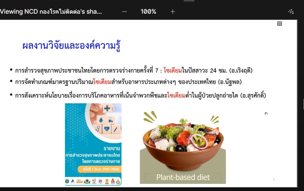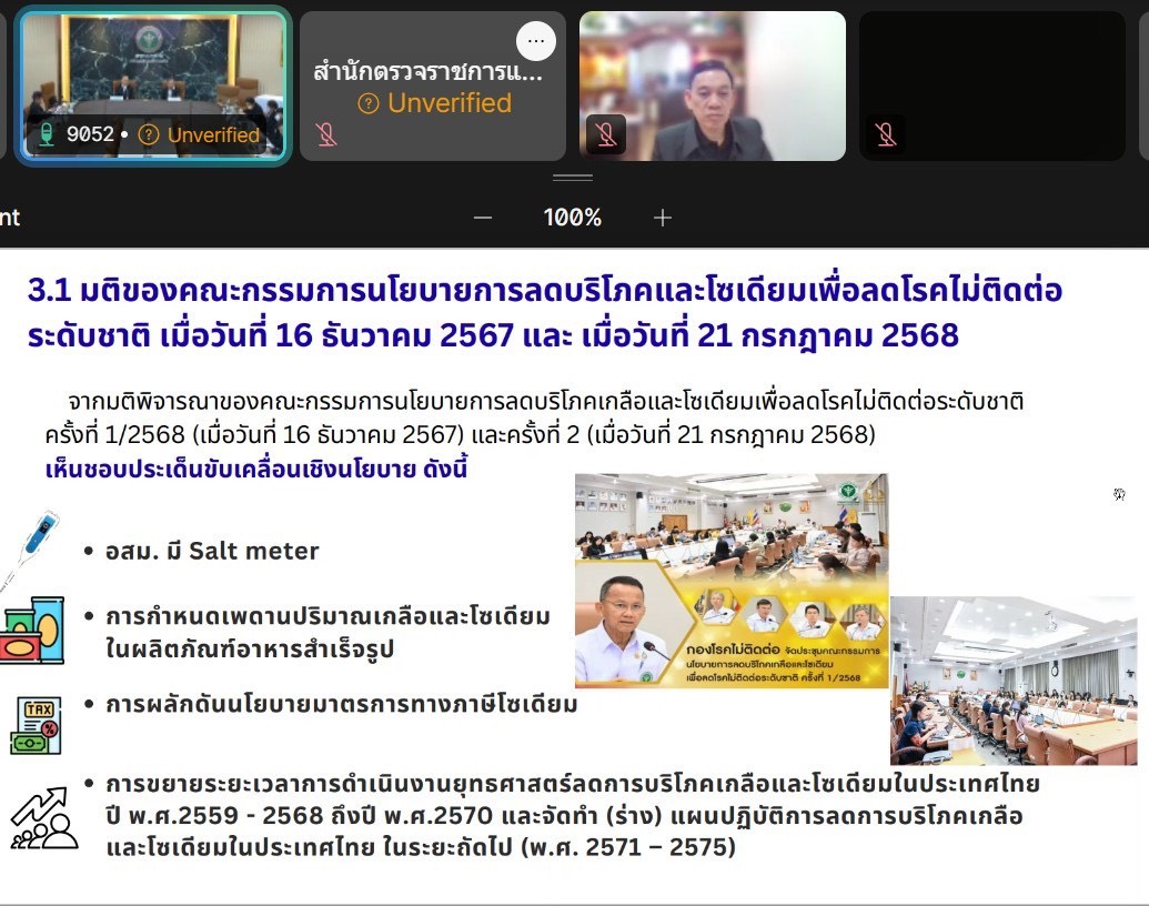 การประชุมคณะอนุกรรมการนโยบายการลดบริโภคเกลือและโซเดียมเพื่อลดโรคไม่ติดต่อระดับชาติ ครั้งที่ 1/2569 ณ ห้องประชุม ประเมิน จันทวิมล กรมควบคุมโรค และผ่านสื่ออิเล็กทรอนิกส์ Cisco WebEx Meeting โดยมี นพ.กฤษฎา หาญบรรเจิด ผู้อำนวยการกองโรคไม่ติดต่อ กรมควบคุมโรค และ ผศ.นพ.สุรศักดิ์ กันตชูเวสศิริ คณะแพทยศาสตร์โรงพยาบาลรามาธิบดี มหาวิทยาลัยมหิดล เป็นประธานการประชุม ได้มีการนำเสนอความก้าวหน้าและแผนการดำเนินงานขับเคลื่อนเชิงนโยบายลดการบริโภคเกลือโซเดียมเพื่อลดโรคไม่ติดต่อระดับชาติ ปีงบประมาณ 2569 โดยในยุทธศาสตร์ที่ 4 การพัฒนางานวิจัยและองค์ความรู้ และการนำสู่ปฏิบัติ สถาบันวิจัยระบบสาธารณสุข (สวรส.) โดย ผศ.ดร.จรวยพร ศรีศศลักษณ์ รองผู้อำนวยการ สวรส. ได้รายงานความก้าวหน้าของงานวิจัย โดยชี้ให้เห็นข้อมูลสถานการณ์สุขภาพคนไทยจากการสำรวจสุขภาพประชาชนไทยโดยการตรวจร่างกายครั้งที่ 7 ที่พบว่าคนไทยบริโภคโซเดียมสูงถึง 3,650 มิลลิกรัมต่อคนต่อวัน ซึ่งสูงกว่าระดับที่องค์การอนามัยโลก (WHO) แนะนำเกือบ 2 เท่า (WHO กำหนดไว้ไม่เกิน 2,000 มิลลิกรัมต่อวัน) ส่งผลให้ตัวเลขผู้ป่วยโรคไม่ติดต่อเรื้อรัง (NCDs) พุ่งสูงขึ้นอย่างต่อเนื่อง โดยเฉพาะโรคความดันโลหิตสูงที่มีจำนวนผู้ป่วยเพิ่มขึ้นถึงประมาณ 4 ล้านคนในช่วง 5 ปีที่ผ่านมา