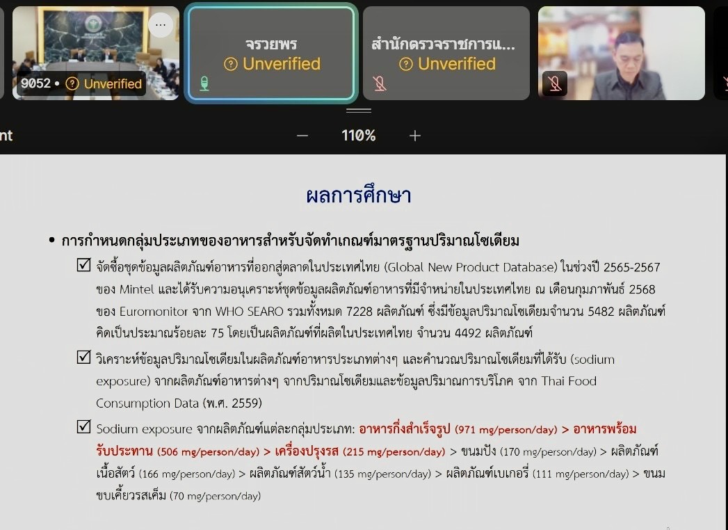 ผศ.ดร.จรวยพร ศรีศศลักษณ์ รองผู้อำนวยการ สวรส. ได้นำเสนอผลการวิจัยสำคัญ 2 เรื่องที่สนับสนุนองค์ความรู้ในการกำหนดนโยบายการลดบริโภคเกลือและโซเดียม เรื่องแรก โครงการสำรวจสุขภาพประชาชนไทยโดยการตรวจร่างกาย ครั้งที่ 7 ประเด็นการเก็บโซเดียมในปัสสาวะ 24 ชม. พบว่า กลุ่มอาหารที่คนไทยได้รับโซเดียมสะสมต่อวันมากที่สุด 3 อันดับแรก ได้แก่ 1) อาหารกึ่งสำเร็จรูป เช่น บะหมี่ โจ๊ก ข้าวต้มกึ่งสำเร็จรูป ฯลฯ สูงถึง 971 มิลลิกรัมต่อคนต่อวัน 2) อาหารพร้อมรับประทาน เช่น อาหารกระป๋อง พิซซ่า ฯลฯ 506 มิลลิกรัมต่อคนต่อวัน 3) เครื่องปรุงรส 215 มิลลิกรัมต่อคนต่อวัน ซึ่งเป็นประเภทอาหารที่ควรมีการกำหนดเกณฑ์มาตรฐานปริมาณโซเดียมอย่างเข้มงวดเป็นลำดับต้นๆ และปัจจุบันมีผลิตภัณฑ์ไม่ถึง 1 ใน 3 ที่ผ่านเกณฑ์มาตรฐานของ WHO รวมถึงควรมีการติดตามปริมาณโซเดียมในผลิตภัณฑ์อาหารตามระยะเวลาที่สอดคล้องกับการดำเนินงาน เช่น ทุก 3-5 ปี และควรลดปริมาณโซเดียมในอาหารที่รับประทานนอกบ้านควบคู่กับการลดปริมาณโซเดียมในผลิตภัณฑ์อาหาร นอกจากนี้กรมสรรพสามิตอาจพิจารณากำหนดเกณฑ์จัดเก็บภาษีตามปริมาณโซเดียมของผลิตภัณฑ์แต่ละประเภท